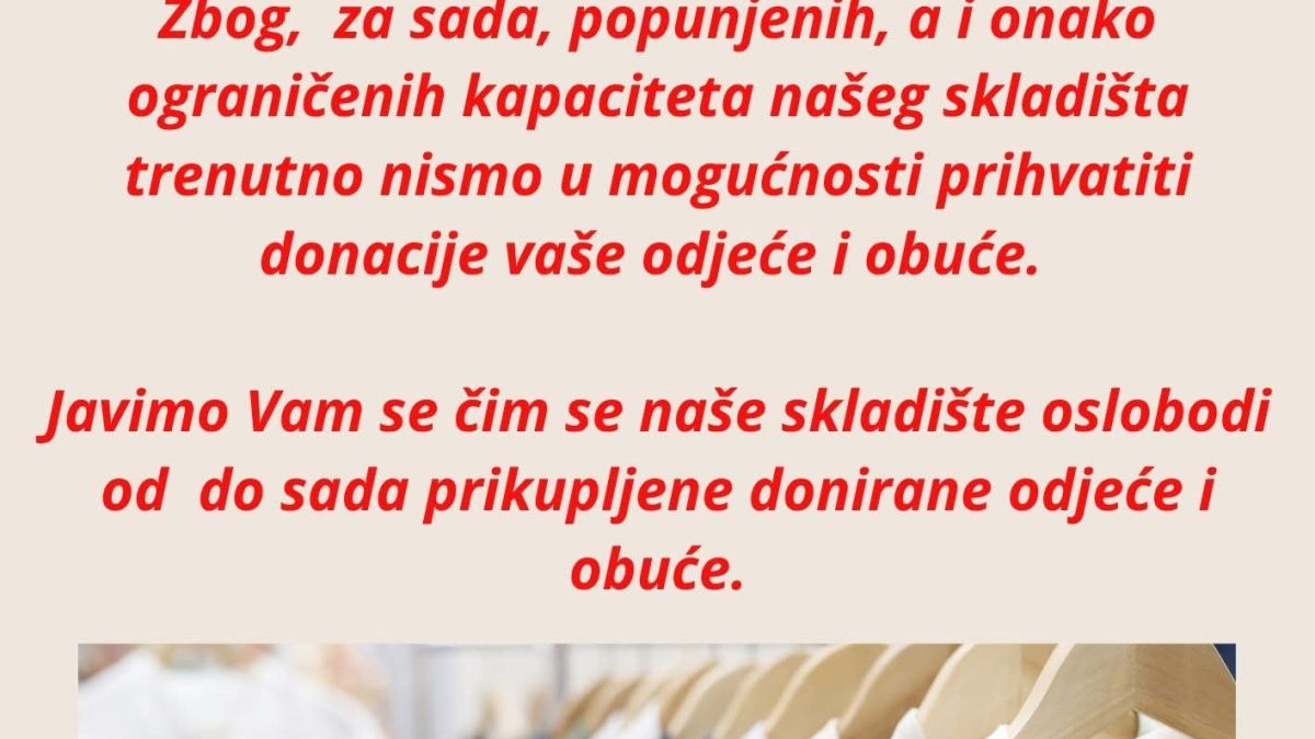 Zbog trenutno popunjenog skladišta te smanjene potražnje, nismo u mogućnosti primati Vaše donacije odjeće i obuće.