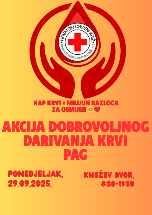 Prva ovogodišnju akcija dobrovoljnog darivanja krvi biti će u ponedjeljak, 3. veljače 2025. godine u Pagu, Knežev dvor u vremenu od 08:30 do 11:30.